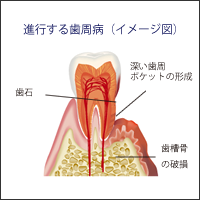 初めは自覚症状がなく、鏡で見ても気がつきませんが、そのうち歯肉が赤くなったり腫れたりします。 プラークが石灰化し歯石になると、自分では取り除きにくくなって歯周病が悪化し、歯と歯肉が付着している部分にすき間(歯周ポケット)ができます。 さらに、炎症が歯肉の内部に進行すると、歯根膜や歯槽骨が破壊されて、歯を固定する力がだんだん弱くなります。 この状態のまま放っておくと、ついには歯を失うことになります。